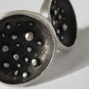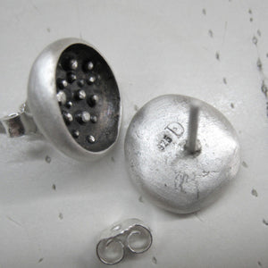 Full Moon silver stud earrings with matte finish, granulation and dark patina
