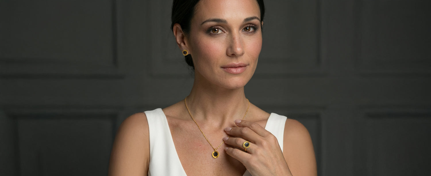 The «Eclipse» pendant features a warm gold-toned outer ring paired with a dark patinated center, creating a refined contrast inspired by the phases of the moon. Crafted from sterling silver 925 with high-quality gold-plated options, it is practical, durable, and perfect for everyday wear.